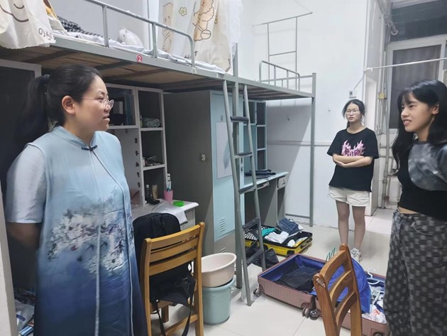 在结束一天的迎新工作后,全体学院领导和辅导员们来到宿舍看望新生。老师们关心了解同学们在入校过程中遇到的问题和困难,并现场协调解决。院领导也鼓励员工尽快适应环境、转换角色,督促同学们了解学院规章制度,谨防诈骗,同时制定学习计划,做好自我管理,在珞珈山下好读书。同学们深受鼓舞感动,向院领导们介绍自身情况,表示了努力学习,积极奋进的决心。